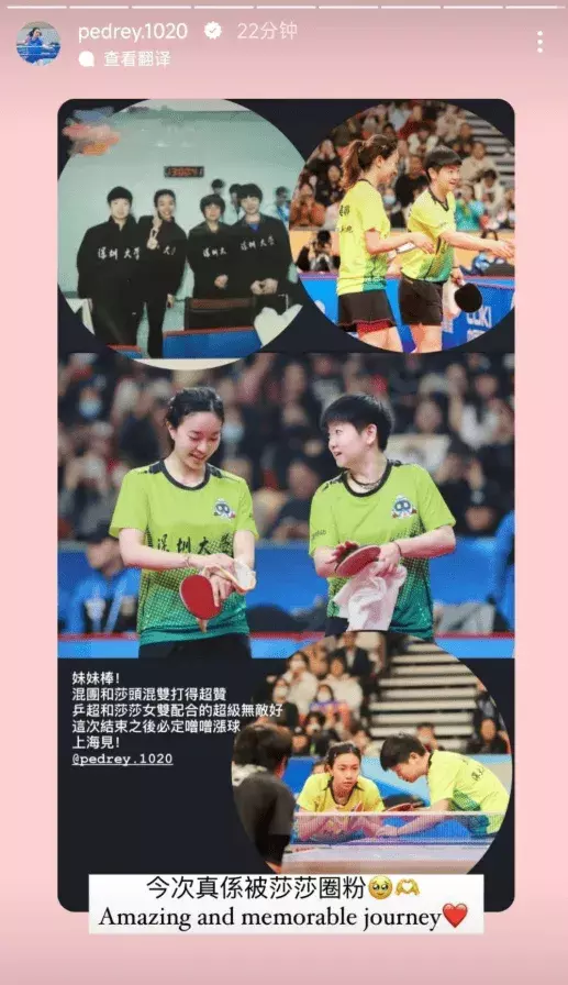 吴咏琳在个东说念主社媒上发布了我方与孙颖莎的赛场照体育赛事直播,并写说念:此次真实被莎莎圈粉????令东说念主咋舌和记起的旅程❤