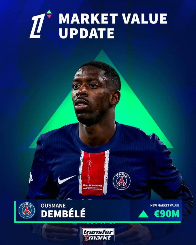 直播吧06月04日讯法甲最新一期身价更新之后,登贝莱身价上升至9000万欧,距离1亿只差1000万。